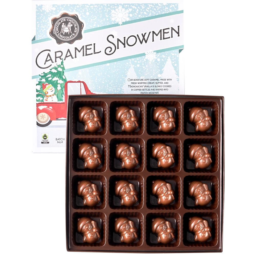 One of our MOST popular holiday confections. Our miniature milk chocolate snowmen are filled with our signature soft buttery caramel, made form cane sugar, Fresh whipping cream, butter and Madagascar Vanilla & slowly cooked in copper kettles.