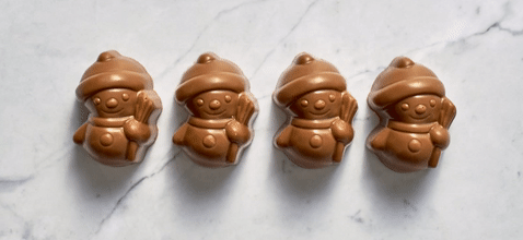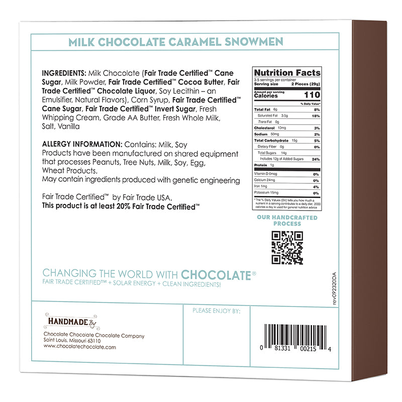 One of our MOST popular holiday confections. Our miniature milk chocolate snowmen are filled with our signature soft buttery caramel, made from cane sugar, Fresh whipping cream, butter, and Madagascar Vanilla & slowly cooked in copper kettles.