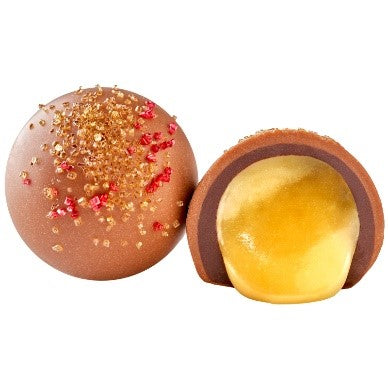 Have you ever tasted a homemade pineapple upside down cake? The candied pineapple, moist cake, cherry on top - its love at first bite. Imagine all of those wonderful flavors coming together in our NEW truffle! Enrobed in milk chocolate and sprinkled with red and yellow sanding sugar !