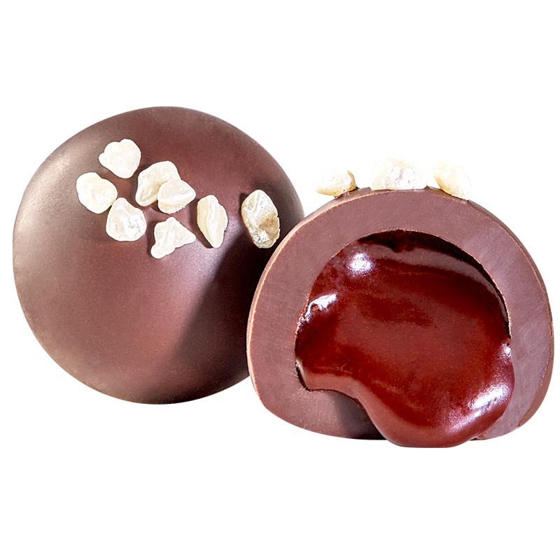 Cheers! A dark chocolate ganache center infused with Marc de Champagne - makes an irresistible creation. Enrobed in dark chocolate and sprinkled with white pearls